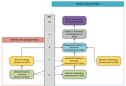 Professional and technical education in geomatics is shaped by the interaction between national qualification policy, institutional practice, and professional regulation. In South Africa, recent curriculum reform must be understood against the background of an earlier qualification system that structured surveying and geomatics education for several decades. Prior to the current framework, geomatics education at universities of technology was largely offered through qualifications developed under the National Education and Training system. These legacy programmes included the National Diploma and Bachelor of Technology, were widely recognised by employers and professional bodies, and were strongly practice-oriented, playing a central role in supplying graduates to both the public and private sectors.