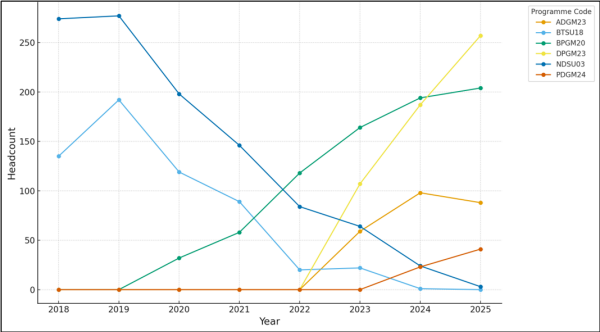 First-time entrant data further illustrate shifts in demand for entry-level qualifications. As shown in Table 2, enrolment moved from the legacy diploma to the new diploma and bachelor pathways as the restructured programme mix matured, reflecting both progression of existing cohorts and sustained new intakes.