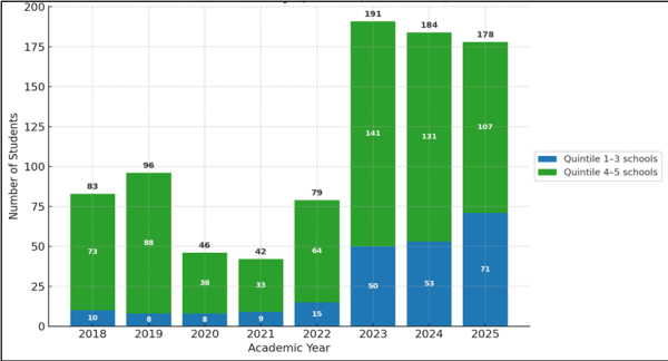 Participation patterns also changed demographically over the review period. Female representation increased from approximately one-quarter of enrolments in 2018 to 44 percent by 2025, while the proportion of students from Quintile 1–3 schools increased from under 10 percent to nearly 40 percent (Figure 4). In the South African schooling system, public schools are classified into quintiles from 1 to 5, with Quintile 1 representing the poorest communities and Quintile 5 the most affluent; growth in enrolments in Quintiles 1–3 therefore indicates expanded participation by students from historically disadvantaged educational backgrounds.